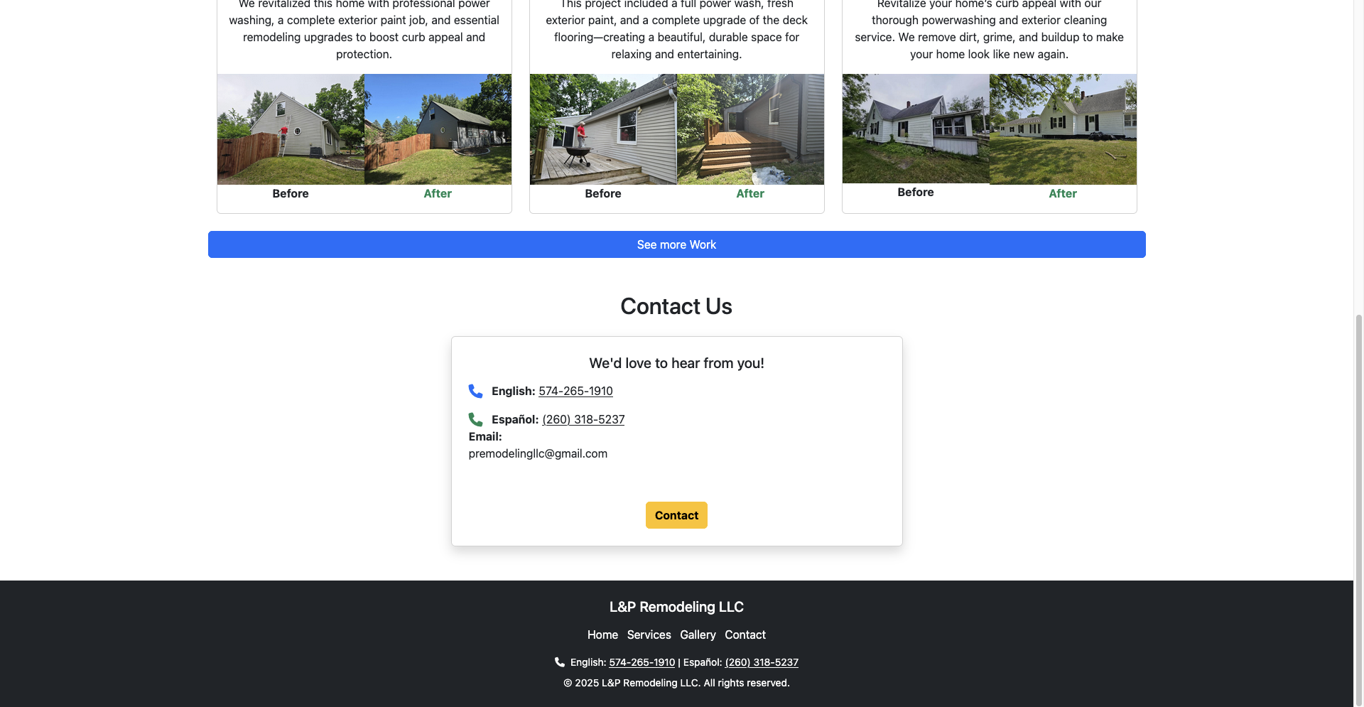 L&P Remodeling LLC is a professional service website designed to land clients showcase their work and services online. The site highlights outdoor projects, service offerings, and easy ways for customers to get in touch — building trust and credibility with potential clients.